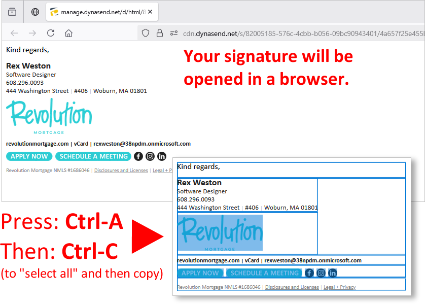Your signature will open in your browser. Press Ctrl-A and then Ctrl-C (this will copy your signature to your clipboard).