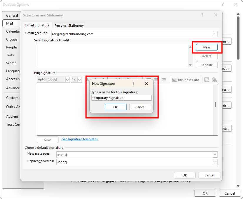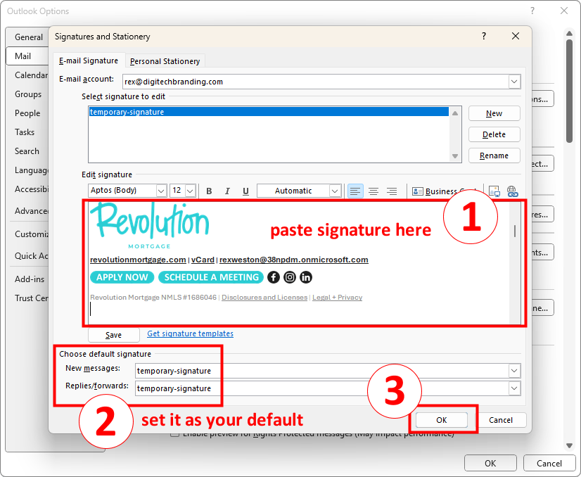 Paste in the signature you previously copied, set it as your default, and click “OK”